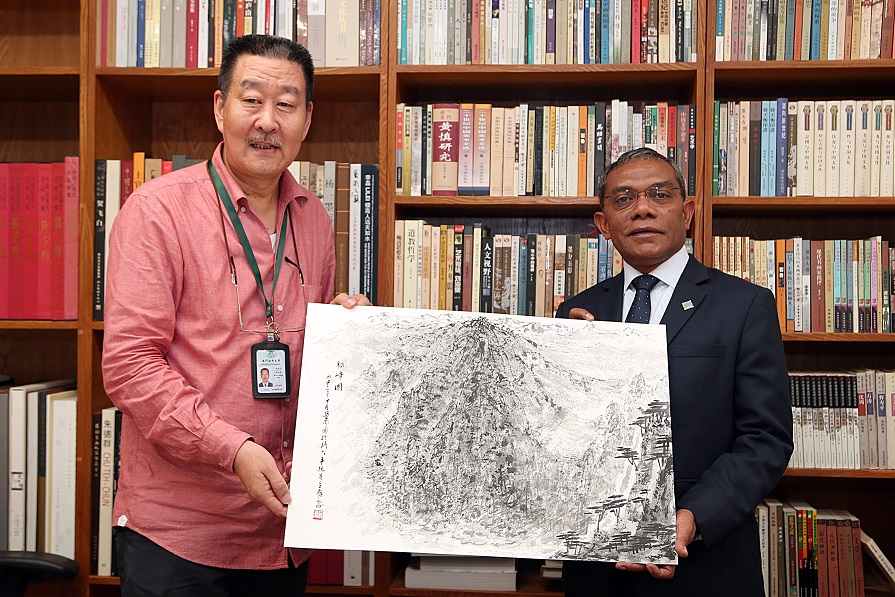 代表團在張曙光校長的陪同下參觀校園設施及教學設備,我校藝術教育中心總監孫蔣濤亦向代表團贈送其作品。隨後,雙方進行了親切會談,張曙光校長及李樹英教務長向對方介紹澳門城市大學的發展史,並表示大學逐步加大國際教育和交流的投入。東帝汶工貿部長也詳細介紹了東帝汶的商業、工業及環境的情況,並希冀今後東帝汶學生與城大學生可以在文化與學術上多進行交流,加強兩地高等教育的合作。