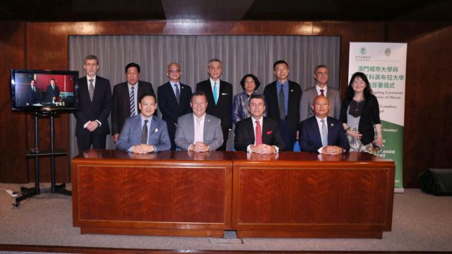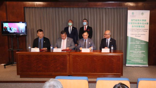 澳門城市大學與葡萄牙科英布拉大學合作備忘錄簽署儀式今天以線上線下結合的方式在葡萄牙駐澳門及香港總領事館何鴻燊博士禮堂舉行,由葡萄牙駐港澳總領事歐冠溢與城大校董會主席陳明金共同見證。同時,為推動合作項目落實,兩校亦簽署聯合開設國際經濟關係高級文憑課程的合作協議,為澳門培養雙文化和雙語人才。