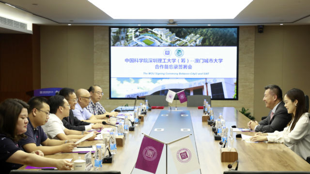 澳門城市大學校長劉駿一行獲中國科學院深圳理工大學(籌,簡稱“中科院深理工”)邀請,於7月28日訪問中科院深理工。澳城大校長劉駿與中科院深理工籌備辦主任、深圳先進院院長樊建平代表雙方簽署合作備忘錄。