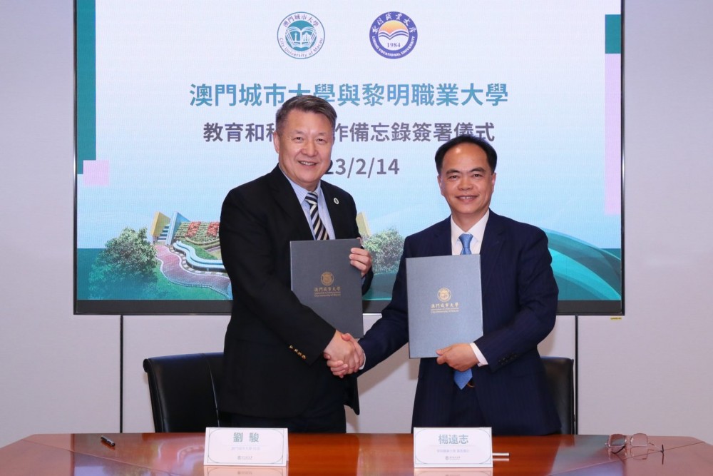 黎明職業大學黨委書記楊遠志率代表團今天到訪澳門城市大學,城大劉駿校長與楊遠志書記分別代表雙方簽署合作備忘錄。雙方希冀深化交流合作,優勢互補,聯合培養人才。期間,來賓參觀了校園環境及教學設施,雙方並圍繞人才引進和培養、學術交流等議題進行座談,展望未來合作。城大副校長孔繁清、葉桂平,黎明職業大學副校長李冬梅、李雲龍一同出席座談。