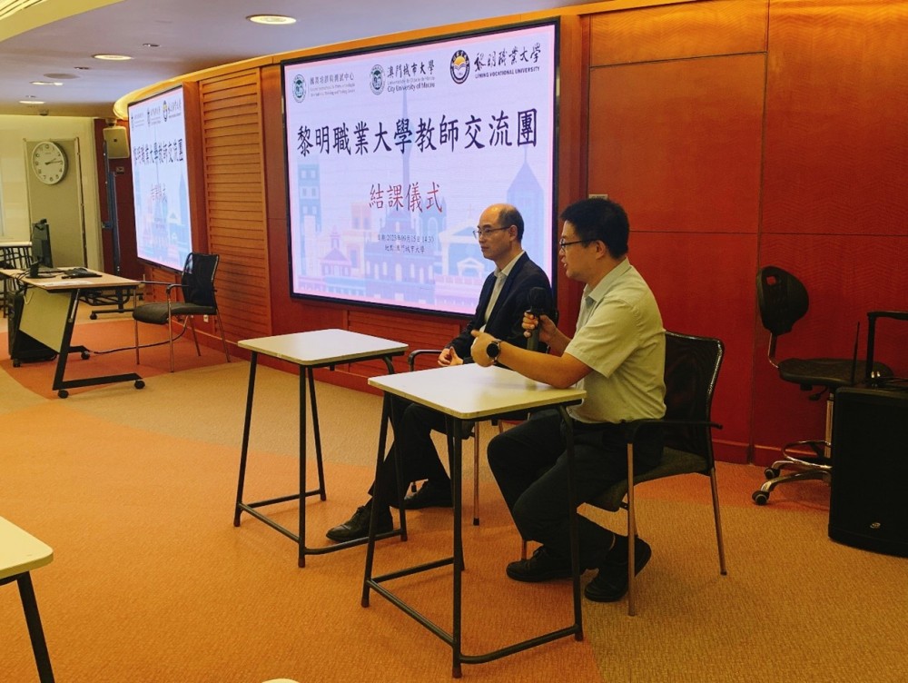 結課儀式上,王忠教授、國際旅遊與管理學院執行副院長李璽教授分別就澳門高校發展,城大教學、科研發展及人才培養等議題,與黎明職業大學管理團隊及教師代表進行深入的交流及探討。黎明職業大學代表團對城大跨學科、跨文化的教學模式,和以學生為中心的教學設計理念表示高度認同。同時,他們談到城大為學生提供的產學助學計劃將有助於為學生提供一個學習與實踐並重的平台,有助於學生盡早做好職業規劃。雙方期望通過本次交流及學習,進一步推動兩校之間的產學研合作、人才培養以及更廣泛的互動交流。