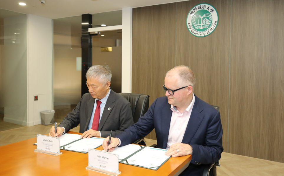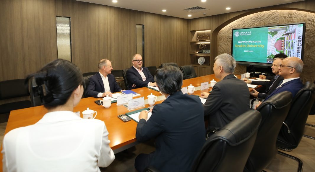 澳大利亞迪肯大學(Deakin University)校長Iain Martin與協理副校長(國際事務)John Molony日前到訪澳門城市大學,獲副校長周萬雷的熱情接待。雙方共同簽署“澳門城市大學與迪肯大學雙學士學位合作項目框架協議”,並啟動城大數據科學學院與迪肯大學Faculty of Science、Engineering and Built Environment的課程合作工作,為城大學子提供了新的國際學習的項目和升學通道。同時,雙方圍繞人才培養、學術研究、聯合課程、師生交流等議題展開了深入的交流與探討,開啟兩校實質性合作的新篇章。